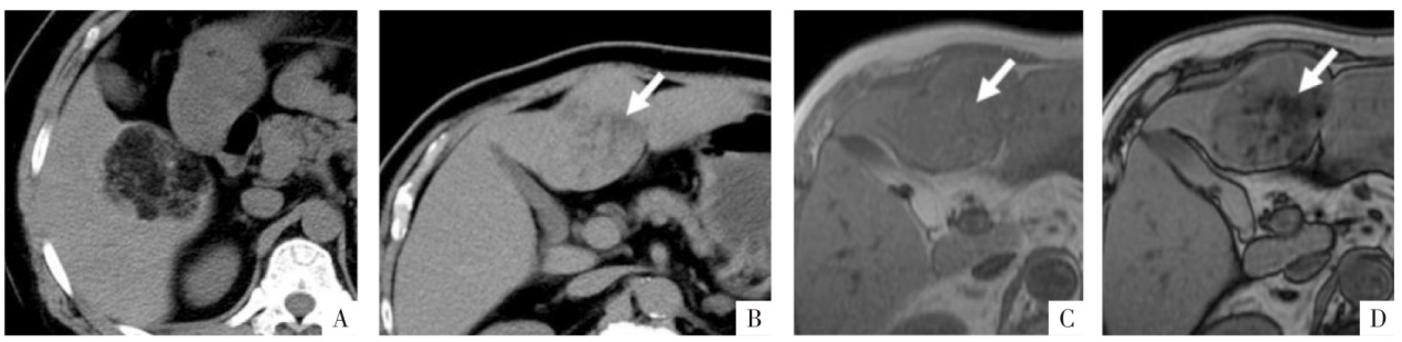 含脂成分的CT与MRI表现。A图,病人女,47岁,肝S5段的血管平滑肌脂肪瘤。CT平扫病灶内可见低密度区域,CT值约为-79 HU,容易确认为脂肪组织。B-D图,病人男,69岁,肝细胞癌脂肪变性。白箭所指为脂肪变性区域,CT平扫上局部呈相对低密度(B),CT值约16 HU,但难以确定为含脂成分;T
