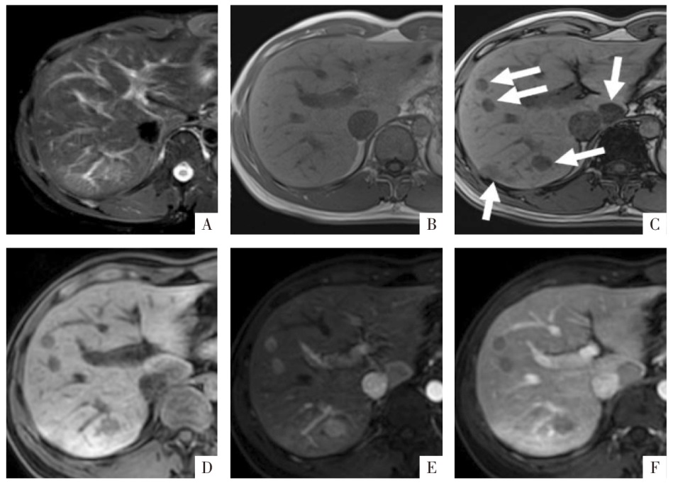 WI同相位及反相位,反相位见肝内多发信号减低区(箭头);D、E、F图分别为增强扫描蒙片、动脉期、门静脉期影像,可见病灶动脉期明显高强化,静脉期廓清,征象类似肝细胞癌的“快进快出”。