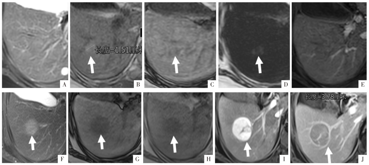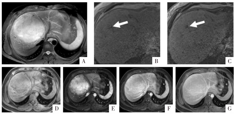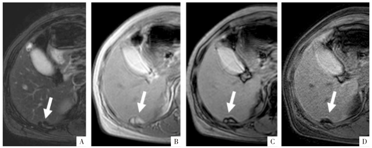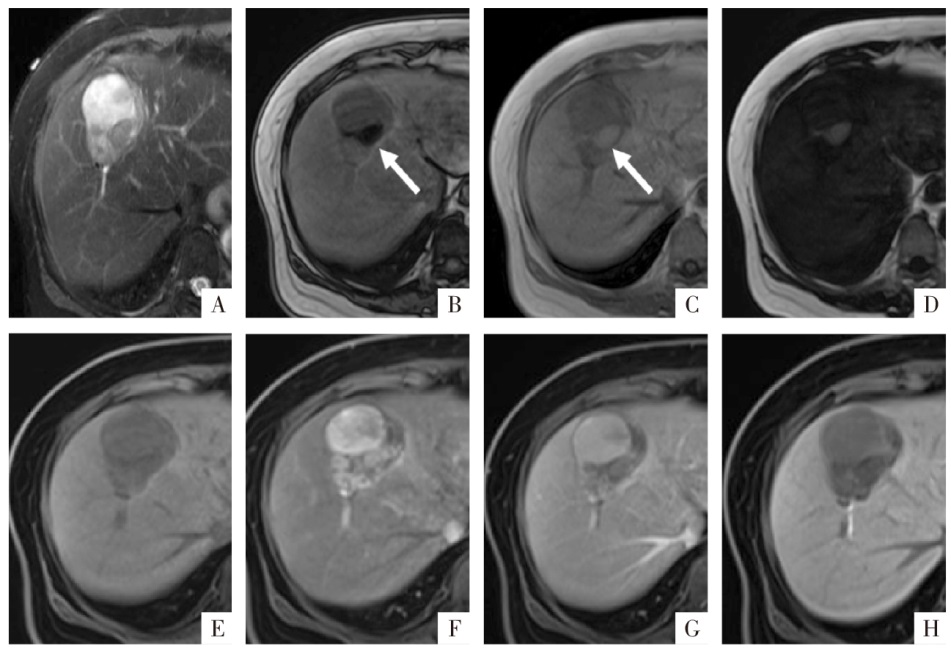 WI上显示肝S8段轻中度高信号肿块。B、C、D图分别为同相位、反相位及脂像,反相位见一信号减低区域(白箭),相应区域在脂像呈明显的高信号,为病灶内的脂肪变性。E—H图分别为钆塞酸二钠增强扫描蒙片、动脉期、门静脉期及肝胆期影像,见非周边的动脉期高强化、廓清,病灶整体在肝胆期的信号要低于周围肝组织。