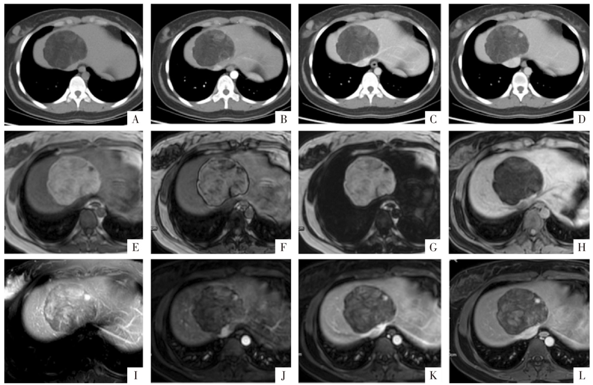WI上显示病变内信号混杂;J、K、L图分别为增强扫描动脉期、门静脉期、延迟期影像,强化特征同CT增强扫描,其中灶状明显强化的成分在T