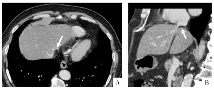 病人男,45岁,下腔静脉旁假性脂肪瘤。A图,CT横断面显示似下腔静脉内充盈缺损(箭头);B图,矢状面多平面重组显示脂肪组织位于下腔静脉旁,挤压下腔静脉(箭头)。