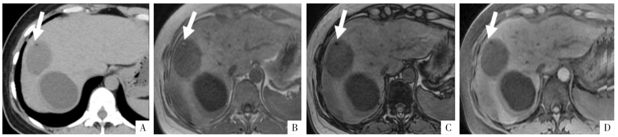 WI,B、C、D图分别为同、反相位及水像(脂肪抑制像),病变表现为右肝后缘包膜下梭形影,同相位高信号,反相位勾边效应,脂肪抑制影像上病变整体呈低信号(白箭)。随访5年无变化。