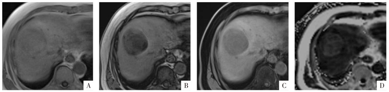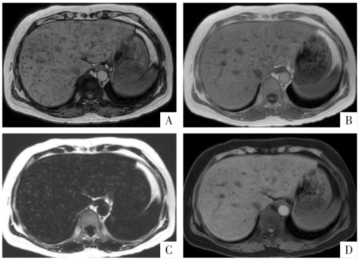 脂肪变性MRI表现。病人男,67岁,肝细胞癌,病灶整体存在较严重的脂肪变性。A—D图分别为三维GRE序列T