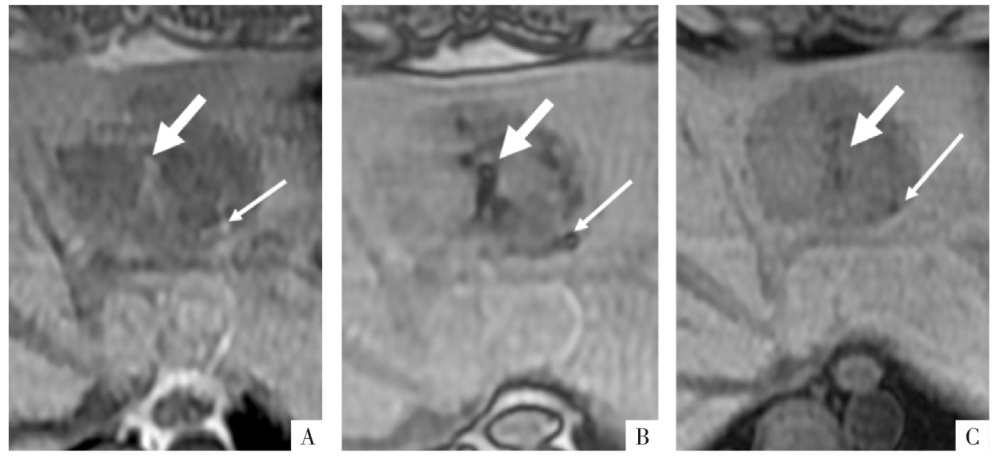 脂肪组织MRI表现。病人女,50岁,上皮样血管平滑肌脂肪瘤,病灶内含有小块的脂肪组织(粗、细箭头)。A、B、C图分别为三维GRE序列T