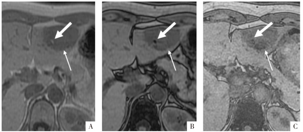 病人女,42岁。手术病理证实为肝左外叶上皮样血管平滑肌脂肪瘤(细箭),内有直径约5 mm小块脂肪(粗箭)。A、B图分别为厚层同相位及反相位影像,层厚6 mm,矩阵256×180,同相位影像上含脂区域呈高信号(A),反相位影像上为含脂区域整体信号衰减(B),易误判为脂肪变性;C图为薄层高分辨力反相位影像,层厚3 mm,矩阵320×288,含脂区域中心仍呈高信号,周围可见勾边,为小脂肪块的典型表现。