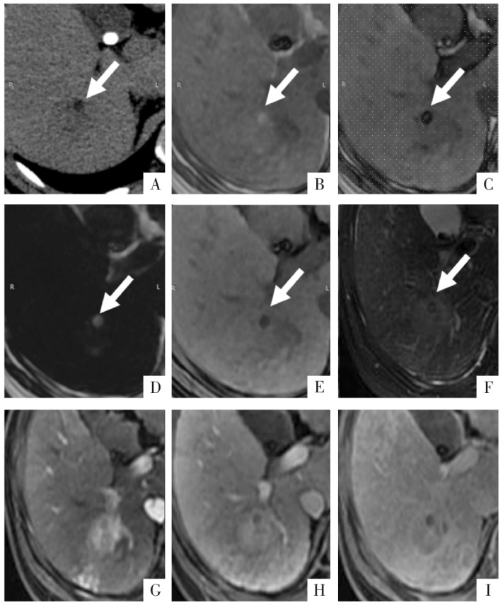 WI,显示肿块呈轻中度稍高信号;G、H、I图分别为动脉期、门静脉期及延迟期影像,可见非周边的动脉期高强化、延迟期廓清以及强化包膜征象,以上为肝细胞癌典型征象。