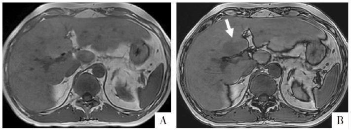 病人男,35岁,局灶性脂肪肝。A、B图分别为T