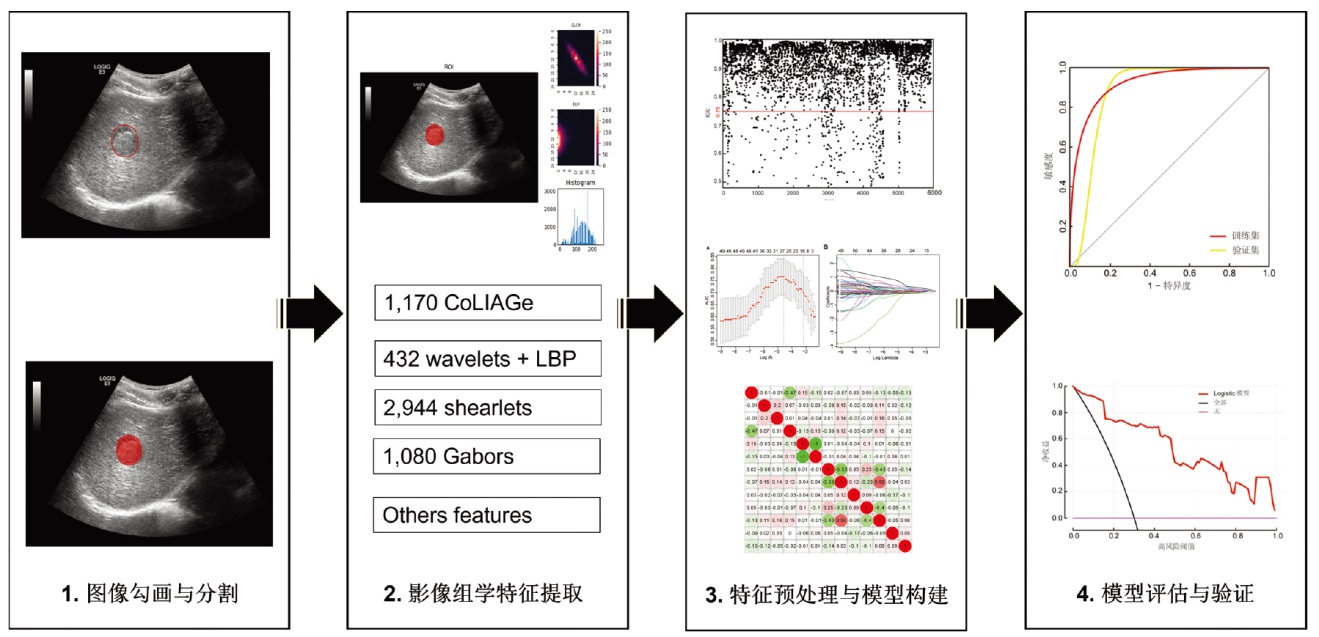 超声影像组学模型构建与评估的流程图