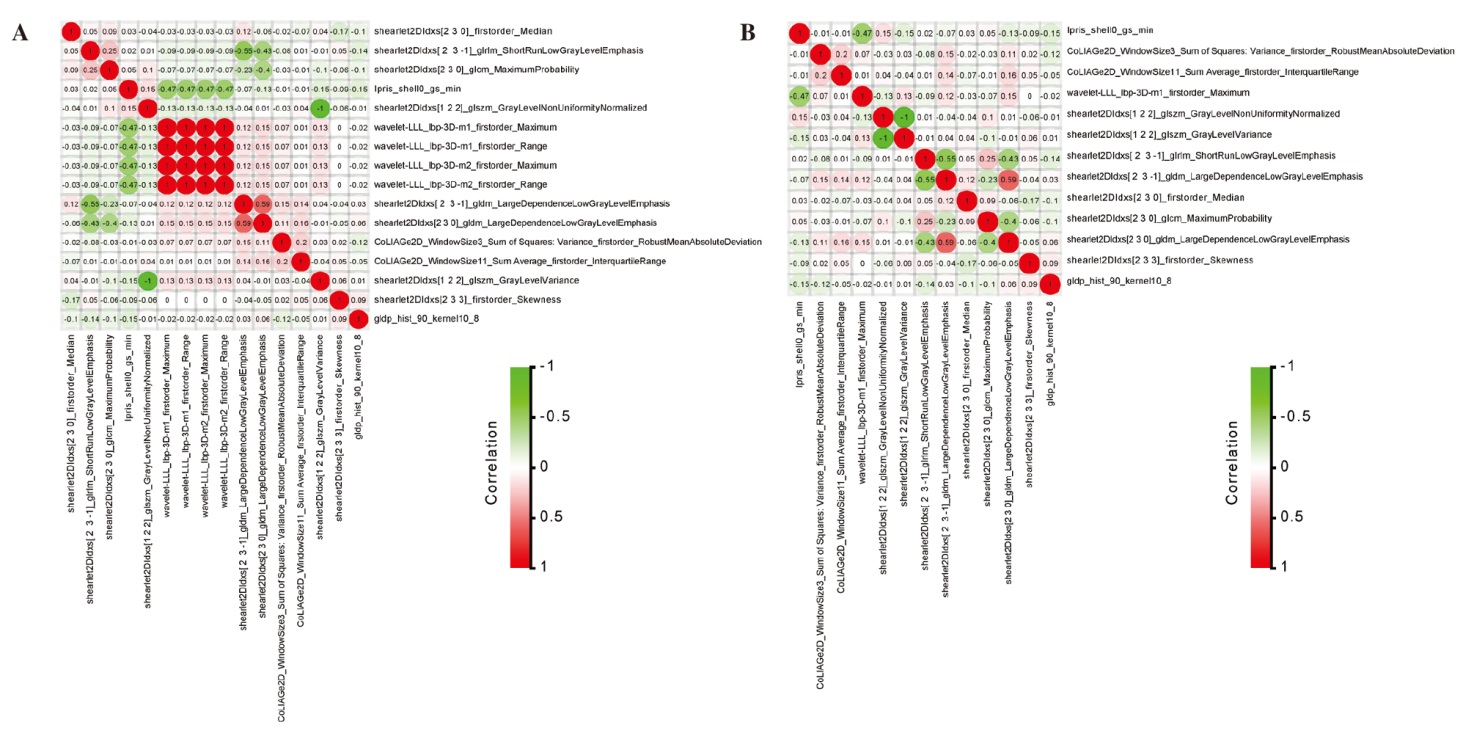 影像组学特征的Pearson相关性分析热图。A图,通过LASSO特征选择获得的影像组学特征的相关性热图。B图,通过相关性分析筛选后的影像组学特征的相关性热图。红色表示特征呈正相关,绿色表示特征呈负相关。