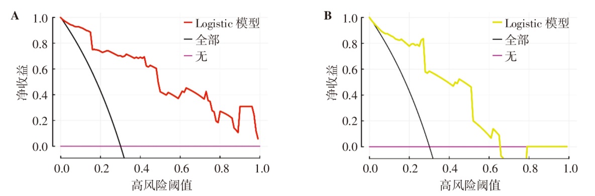 Logistic模型DCA曲线。A代表训练集,B代表验证集。