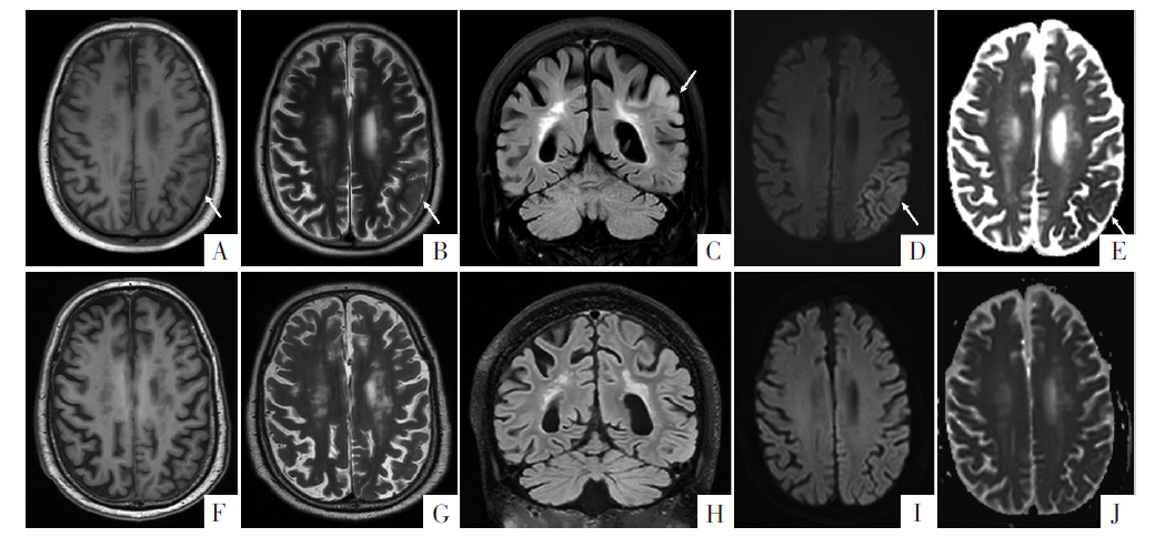 WI、FLAIR、 DWI和ADC图。F-J图为治疗后影像,异常信号消失。