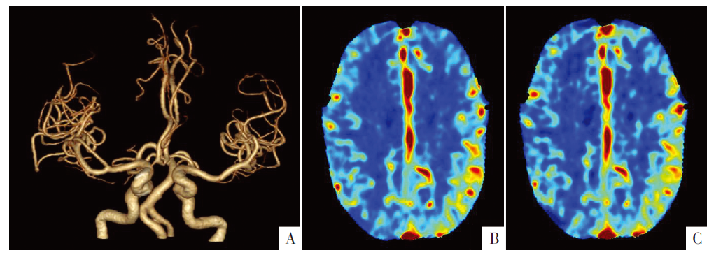 头颅CTA和CTP影像。A图为CTA容积再现(VR重建)。B、C图为CTP影像,B图为脑血流量,C图为脑血容量。
