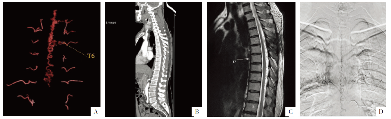 病人男,49岁,1年前出现双下肢麻木并伴下肢力量减弱,4个月前症状加重,诊断为脊髓血管畸形。A图,CTA VR重组影像显示胸段椎管内可见迂曲畸形血管影;B图,CT矢状面重组影像显示胸段椎管内可见迂曲畸形血管影;C图,MRI平扫T